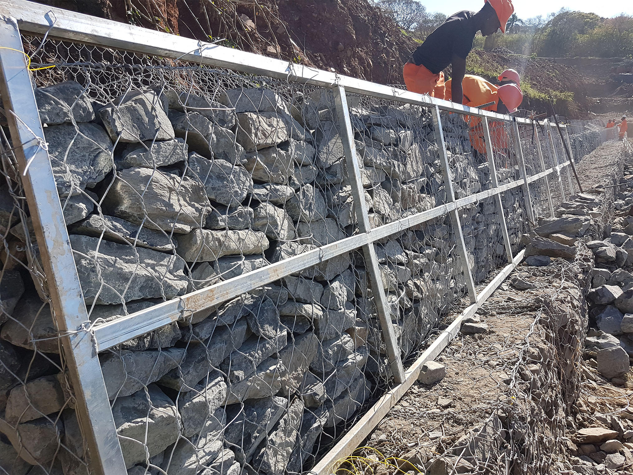 Site Conditions presented considerable complications for material handling and safe working conditions. Bulk materials would be offloaded at top level platform and the Gabion structure being constructed located 30m below. Two driveways were cut across the steep banks to facilitate material conveying.